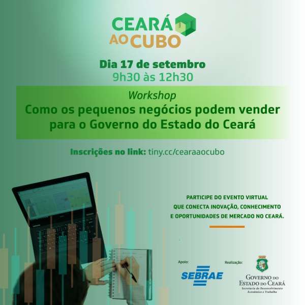 O Ceará ao Cubo é totalmente gratuito e será transmitido pelo canal do YouTube da Sedet. O evento conta com o apoio institucional do Sebrae Ceará, Federação das Indústrias (Fiec). Conselho Regional de Contabilidade (CRC) e Federação da Agricultura e Pecuária do Estado do Ceará (Faec).