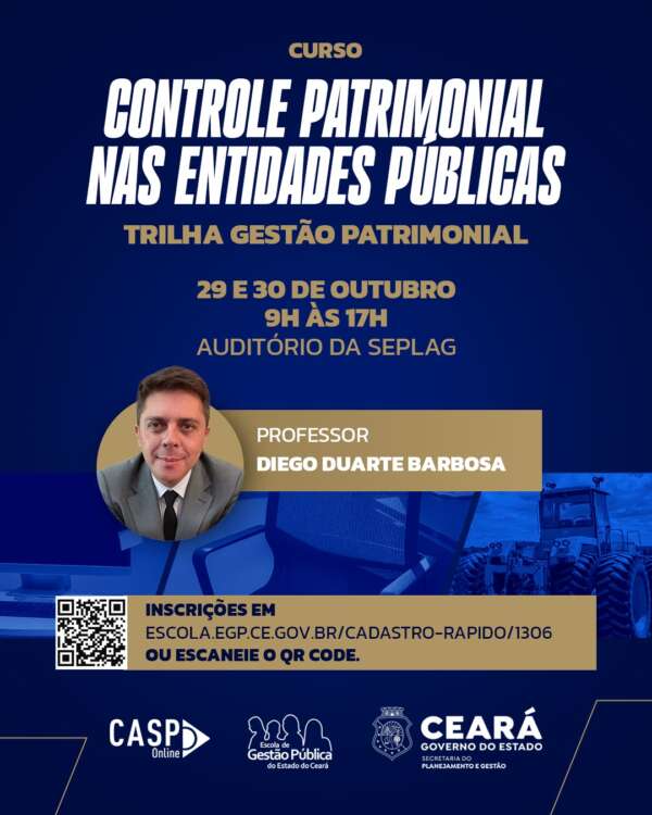 Como parte das ações definidas no Termo de Ajustamento de Gestão (TAG) assinado pelo Governo do Ceará com o Tribunal de Contas do Estado (TCE) para melhorar a gestão dos imóveis públicos, a Secretaria do Planejamento e Gestão do Ceará (Seplag-CE) realizará, nos dias 29 e 30 de outubro, o curso “Controle patrimonial nas entidades públicas”, ministrado pelo especialista Diogo Duarte da Costa, referência nacional no assunto.