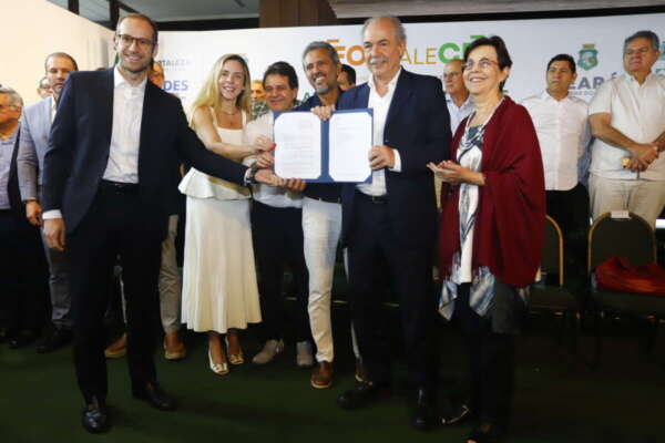 Em cerimônia realizada no Palácio da Abolição, em Fortaleza, nesta terça-feira (27), o Banco Nacional de Desenvolvimento Econômico e Social (BNDES), o Governo do Ceará e a Prefeitura de Fortaleza anunciaram um pacote de investimentos voltado ao desenvolvimento do estado, somando R$ 1,1 bilhão em financiamentos aos setores público e privado. O evento contou com a presença do governador Elmano de Freitas, da vice-governadora Jade Romero, e do presidente do órgão federal, Aloizio Mercadante, além do presidente da Assembleia Legislativa do Ceará (Alece), Romeu Aldigueri, secretários de Estado e outras autoridades.