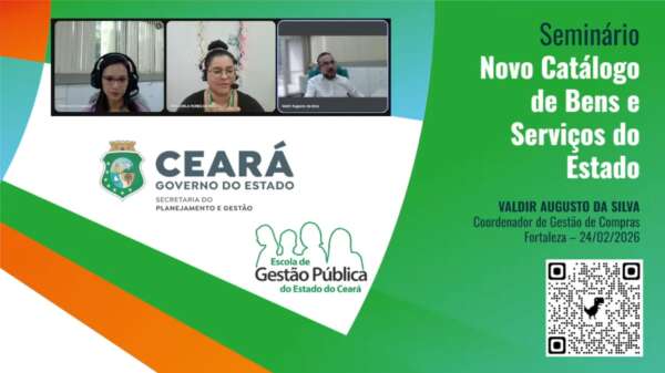 A Secretaria do Planejamento e Gestão (Seplag), por meio da Coordenadoria de Gestão de Compras (Cogec), em parceria com a Escola de Gestão Pública do Estado do Ceará (EGP-CE), realizou, no último dia 24 de fevereiro, o Seminário de Implantação do novo Catálogo de Bens e Serviços do Estado, na modalidade online. A iniciativa foi direcionada aos agentes públicos estaduais e municipais que atuam em processos de contratação pública e utilizam o sistema corporativo de compras.