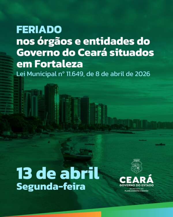 O Governo do Ceará, por meio da Secretaria do Planejamento e Gestão (Seplag-CE), informa que não haverá expediente nos órgãos e entidades estaduais localizados em Fortaleza na próxima segunda-feira, dia 13 de abril, aniversário da capital cearense, conforme a Lei nº 11.649, de 08 de abril de 2026.